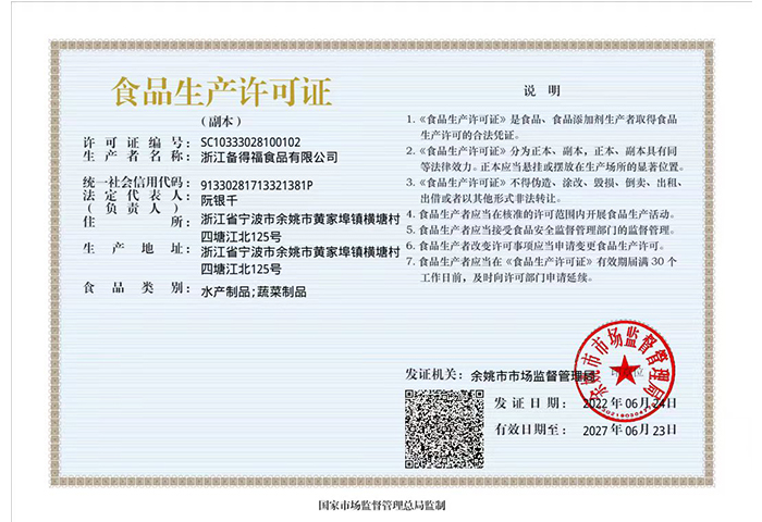 • 廠 名:浙江備得福食品有限公司